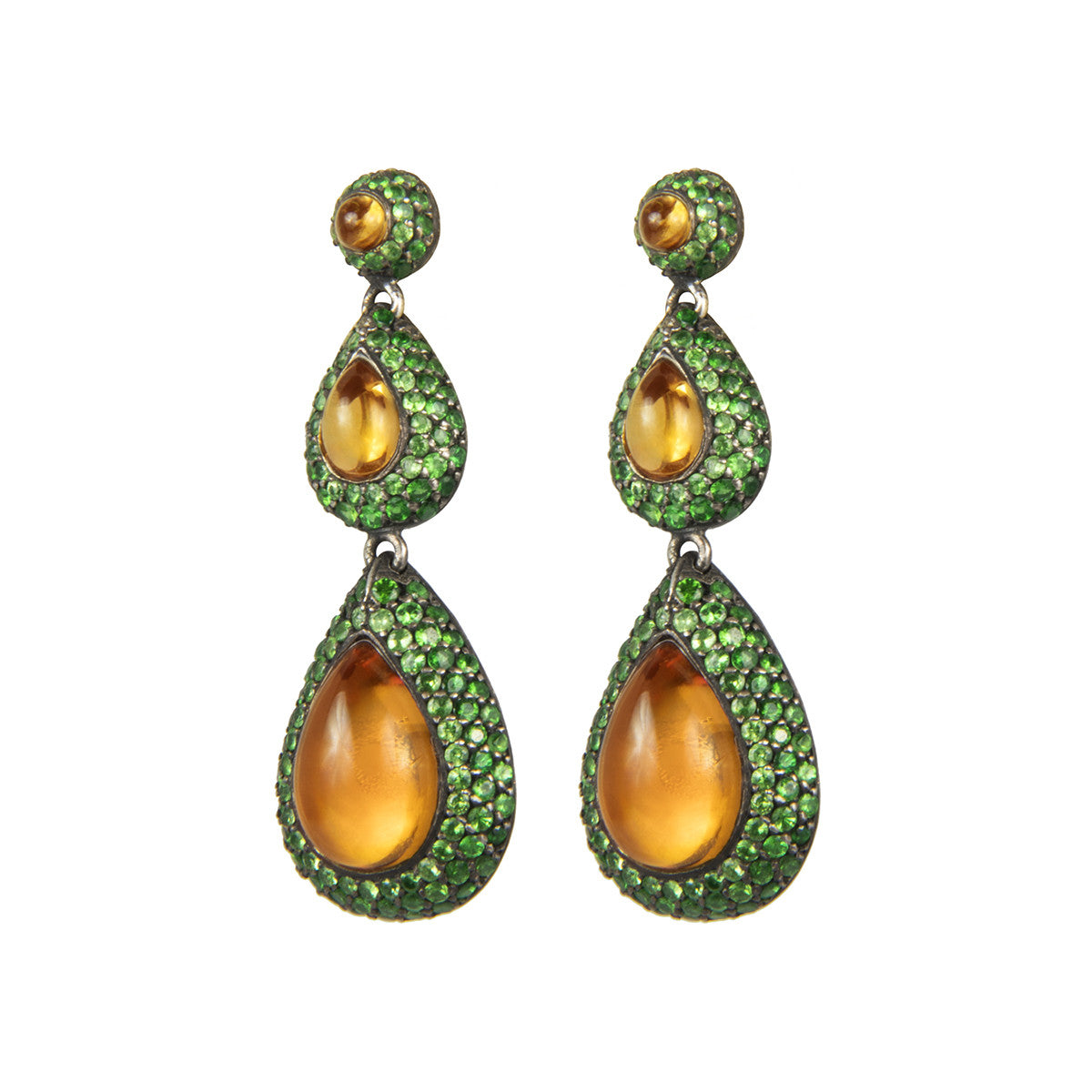 Citrine cabochons in round and teardrop shapes, surrounded by three rows of vibrant green tsavorite garnet pavé. An open back design allows this earring to be lightweight and comfortable.