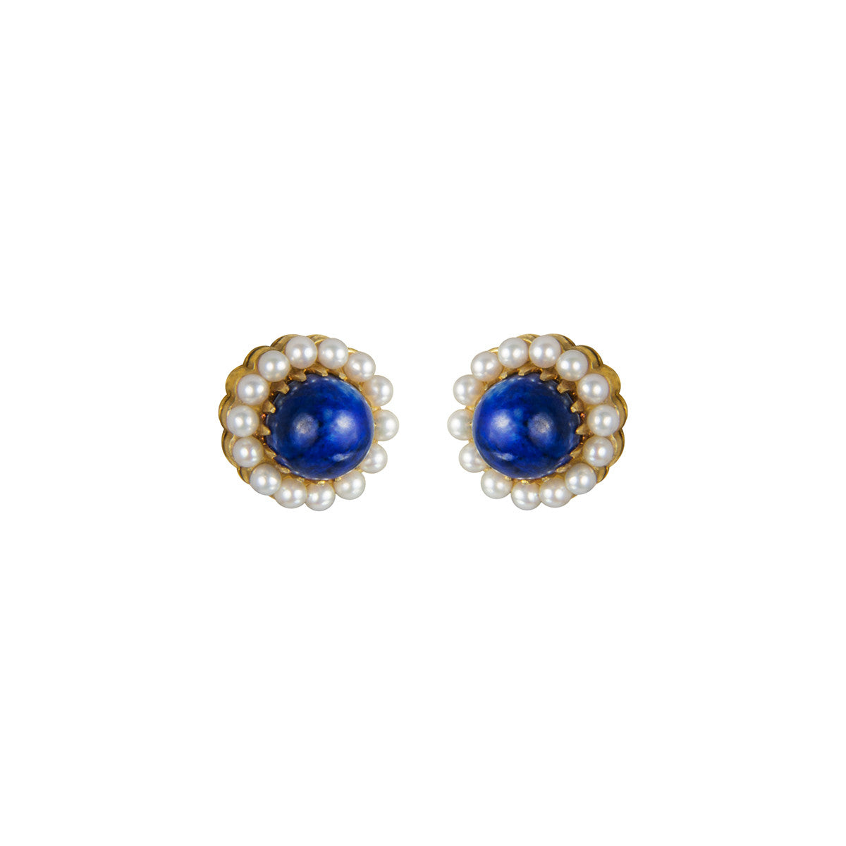 This stud features a lapis cabochon surrounded by pearls, all set in silver with gold vermeil. Post back.